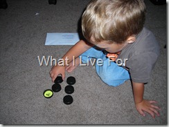 Use the lid to trace a circle around the letter, or whatever you want to put in the lids...it could be numbers to teach math, or shapes, or colors! This is so easily adapted to different ages. DSCN3659